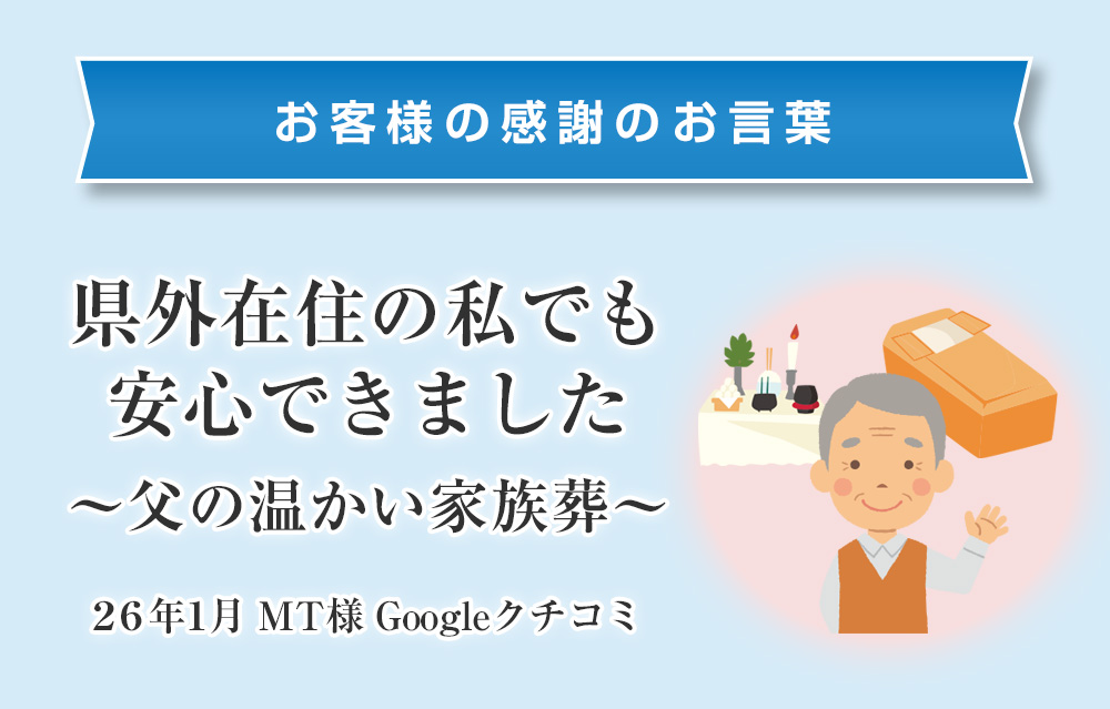 又、式後に必要となる手続きの説明や注意事項も丁寧にご説明いただき、これからも安心できる相談先として頼りにしております。